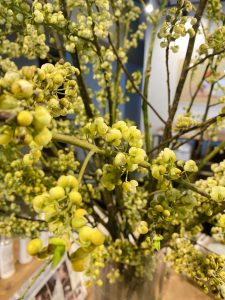 アオモジっていう花だそうです。最初は実みたいな粒がたくさんついてて、それが蕾でだんだん咲いてきました。