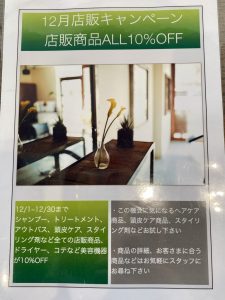 美容室caruでは12月はシャンプーやヘアオイルなどの商品が全品10%オフになるキャンペーンを実施中です!
